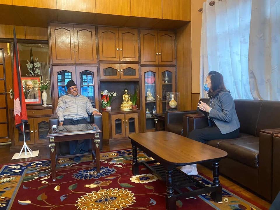 आज शुक्रवार पुर्व प्रधानमन्त्री तथा नेपाल कम्युनिष्ट पार्टी नेकपाका कार्यकारी अध्यक्षसमेत  प्रचण्डको निवासमै पुगी उहाले भेट गर्नुभएको हो । भेटमा समसायिम विषयवस्तु र कोरोना भाइरसको संक्रमण रोकथामका विषयमा कुरा भएको छ । नेकपा अध्यक्ष प्रचण्डले मित्र राष्ट्र चीनको बढ्दो सहयोग एवम् चासोप्रति धन्यवाद दिंदै नेकपा अझ एकताबद्ध हुने विश्वास ब्यक्त गरेको नेकपा स्रोतले बताएको छ । ‘प्रचण्ड र राजदूतबीच झण्डै २० मिनेट कुराकानी भएको थियो।’