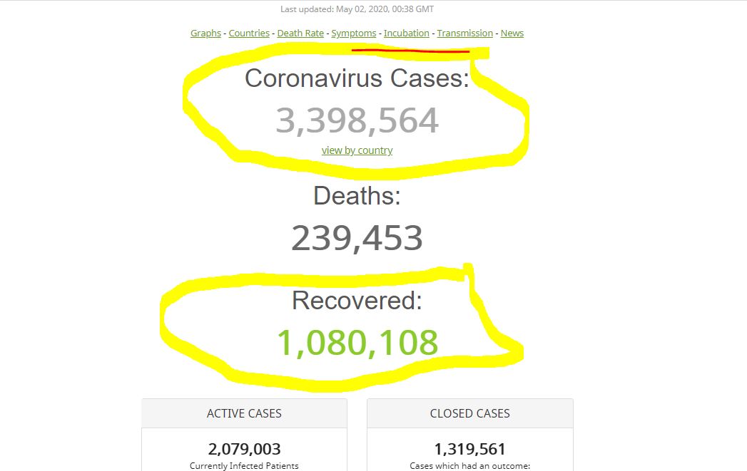 ४ महिनादेखि फैलिएको कोरोना भाइरसको महामारीबाट ३३ लाख ९८ हजार ४५८ मानिस संक्रमित भएका छन् । कोरोना भाइरसको संक्रमणमा परेका १० लाख ८० हजार १०१ जना मानिस उपचारपछि निको भइ घर फर्केका छन् ।