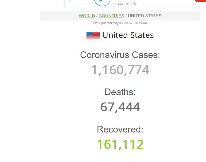 अमेरिकामा पछिल्लो २४ घण्टामा आइतबार विहान समाचार तयार पार्दासम्म १ हजार ६४३ जनाले ज्यान गुमाएका छन् । योसँगै अमेरिकामा मृत्यु हुनेको संख्या ६७ हजार ४४४ पुगेको छ ।