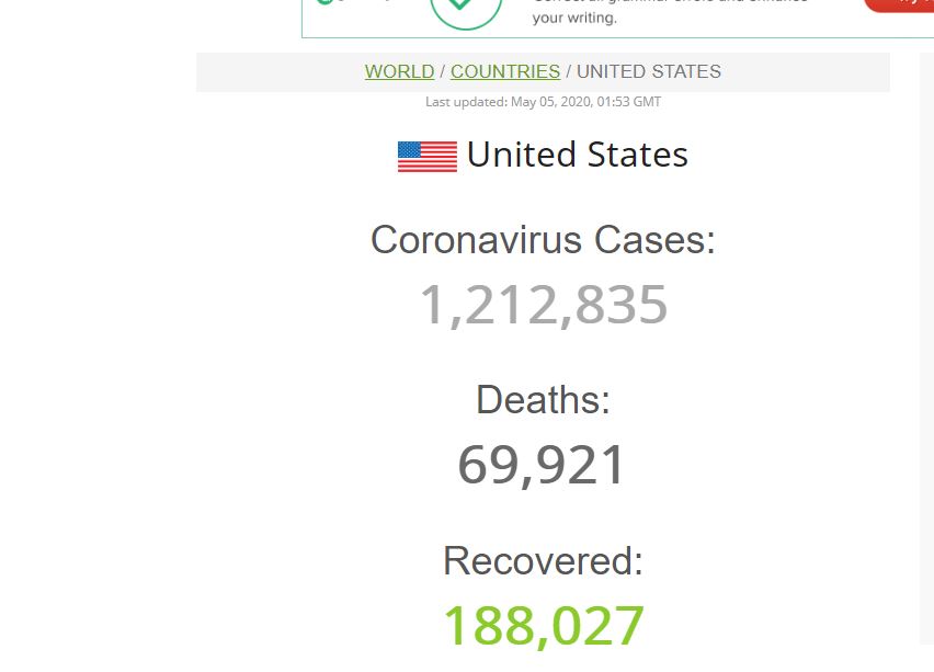 कोरोनाकै कारण ६९ हजारभन्दा बढीको मृत्यु भएको छ । यो समाचार तयार पार्दासम्म थप १ हजार १४२ जनाको मृत्यु भएको छ । योसँगै कोरोनाको संक्रमणबाट अमेरिकामा मृत्यु हुनेको संख्या ६९ हजार ९२१ पुगेको छ । संक्रमित मध्ये १ लाख ८८ हजार २७ जना उपचार पछि निको भएका छन् ।