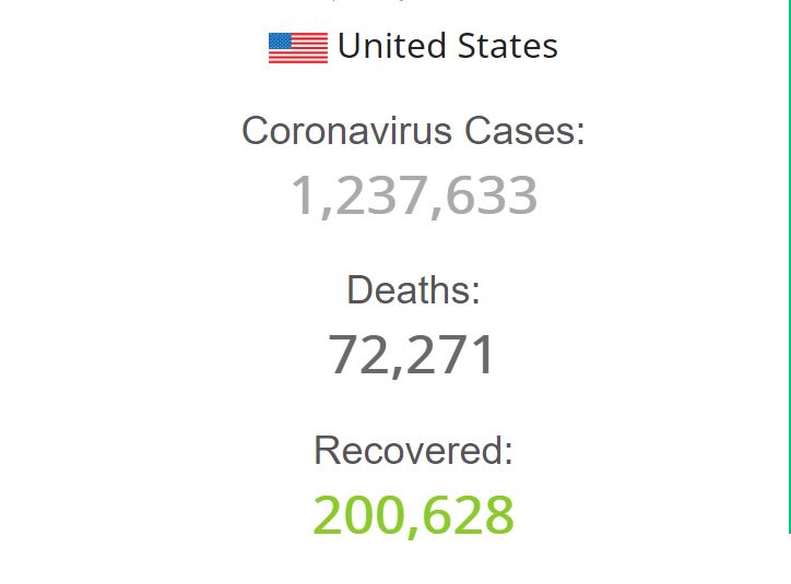 काठमाडौं, २४ बैशाख । विश्वभर महामारीको रुप लिएको कोरोना भाइरसको महामारीले अमेरिकामा ७२ हजारभन्दा बढीको मृत्यु भएको छ ।