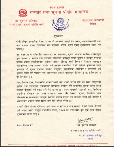 पाँचौं राष्ट्रिय पत्रकारिता दिवस तथा गोरखापत्रको १२० वर्ष प्रवेशको सन्दर्भमा शुभकामना दिँदै अर्थमन्त्री तथा संचारमन्त्रीले पत्रकारको पेसागत हकहित र स्वतन्त्रता रक्षाका लागि सरकार साथमा रहेको स्पष्ट पार्नुभएको छ । संचारमन्त्री खतिवडाले लकडाउनको कठिन परिस्थितिमा पत्रकार एवं सञ्चारकर्मीले गरिरहेको कार्यसम्पादनप्रति सम्मान पनि व्यक्त गर्नुभएको छ । “प्रेस स्वतन्त्रताप्रति हाम्रो प्रतिबद्धता र अविचलित निष्ठा रहेको छ। प्रेस स्वतन्त्रता, लोकतन्त्र र राष्ट्रियताको संरक्षण, सामाजिक न्याय र समानताको प्रत्याभूति गर्दै शान्ति र स्थायित्वको प्रवद्र्धन तथा मानवअधिकारसम्बन्धी सरोकारलाई प्राथमिकतामा राखेर विकास र निर्माणमा सरकार अग्रसर रहेको छ”, मन्त्री खतिवडाले भन्नु भएको छ । “परम्परागत र नयाँ विद्युतीय आमसञ्चारमाध्यमदेखि सामाजिक सञ्जालसम्म आधारहीन सामग्री सम्प्रेषण हुन नदिन सबैभन्दा पहिले पत्रकार एवं सञ्चारकर्मी नै सजग हुनुपर्छ।”