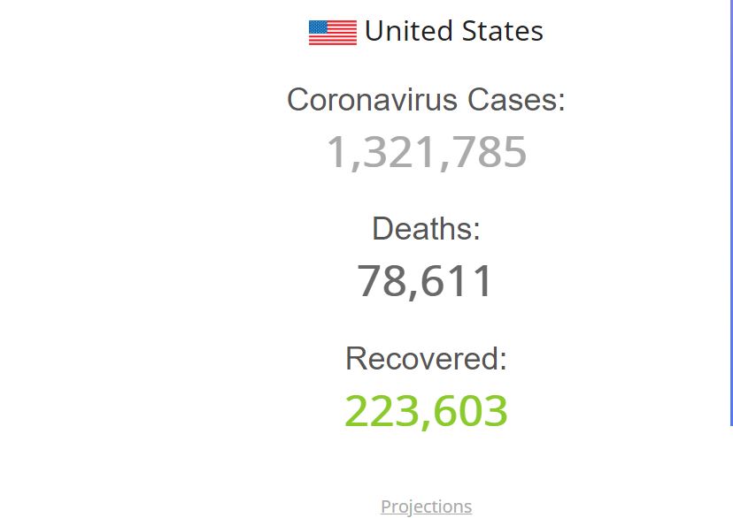 यो समाचार तयार पार्दासम्म एकैदिन थप १ हजार ६८३ जनाको मृत्यु भएको छ । योसँगै कुल मृतक संख्या ७८ हजार ६११ पुगेको छ । पछिल्लो २४ घण्टामा त्यहाँ २९ हजार १६२ जना नयाँ संक्रमित थपिएसँगै कुल संक्रमितको संख्या १३ लाख २१ हजार ७८५ पुगेको छ । अमेरिकामा संक्रमितमध्ये २ लाख २३ हजार ६०३ जना उपचारपछि निको भएका छन् । उपचार गराइरहेका १० लाख १९ हजार ५७१ जनामध्ये १६ हजार ९७८ जनाको अवस्था गम्भीर रहेको छ ।