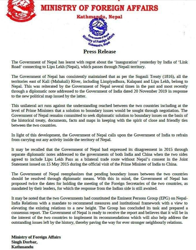 पछिल्लो समय भारतले जारी गरेको नयाँ राजनैतिक नक्शाको जवाफमा २० नोभेम्बर २०१९ मा भारत सरकारलाई सम्बोधन गरिएको कुटनैतिक नोटमा पनि यस कुरालाई दोहोर्याएको थियो । यस्तो अवस्थामा नेपाल सरकारको विना अनुमति सडक मार्ग खोल्नु नेपालको लागि दुखद् कुरा हो । यस कुराको नेपालले घोर भत्सर्ना गर्दछ ।