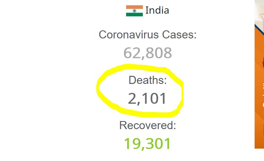 भारतमा कोरोना भाइरसले २ हजार १ सयभन्दा बढीको मृत्यु, ६२ हजार ८ सय ८ जना संक्रमित