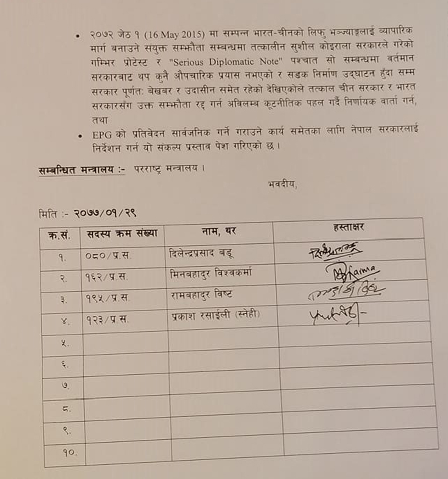 नेपाल र भारतबीच भएका सहमति, सम्झौता र व्यवस्थापनको पुनरावलोकन गर्ने र बदलिँदो समयको आवश्यकताका आधारमा दुवै सरकारलाई सिफारिस गर्न २०७२ सालमा ईपीजी गठन गरेकोमा इपीजीले काम सकेको २ बर्ष भइसक्दा समेत अझै प्रतिववेदन नबुझाएकाले तत्काल प्रतिवेदन बुझाएर सार्वजनिक गर्न सरकारलाई निर्देशन दिन संकल्प प्रस्ताव पेश गरिएको छ ।