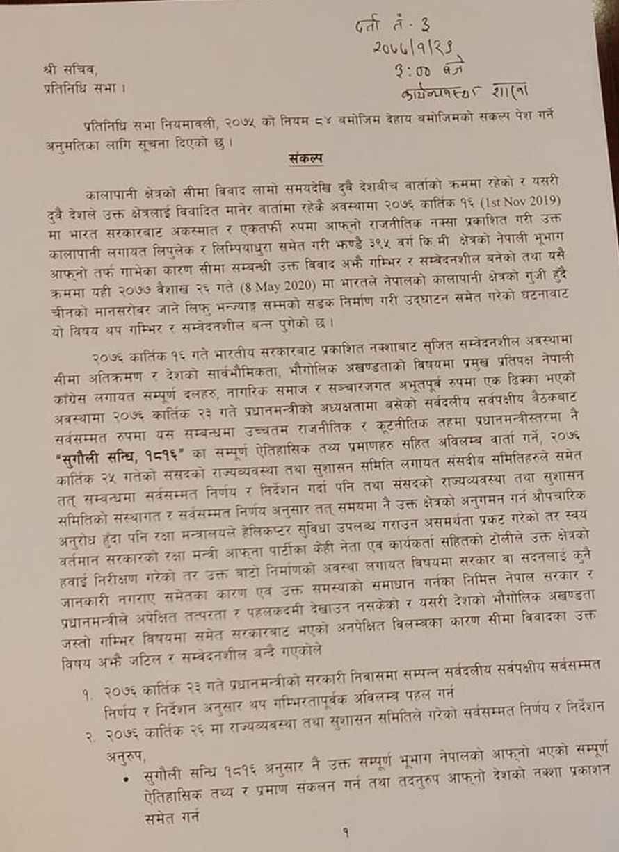 काठमाडौं, २९ बैशाख । भारत–चीनको लिफु भञ्ज्याङ्गलाई व्यापारिक मार्ग बनाउने भारत र तीनको सम्झौता रद्द गर्न निर्णायक वार्ता गर्न र नेपाल भारत प्रवुद्ध समूह (ईपीजी)को प्रतिवेदन सार्वजनिकको माग गर्दै संसदमा सार्वजनिक महत्वको प्रस्ताव दर्ता भएको छ । प्रमुख विपक्षी दल नेपाली कांग्रेसका सांसदहरु दिलेन्द्रप्रसाद बडु, मिनबहादुर विश्वकर्मा, रामबहादुर विष्ट र प्रकाश रसाइलीले संकल्प प्रस्ताव दर्ता गर्नु भएको हो । संकल्प प्रस्तावमा संसदीय समितिको निर्देशनअनुसार सुगौली सन्धि १८१६ अनुसार नेपालको नक्सा प्रकाशन समेत सरकारलाई भन्नुपर्ने समेत माग गरिएको छ ।