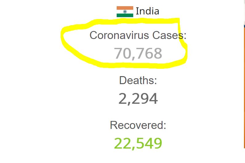 भारतमा पछिल्लो २४ घण्टामा ८२ जनाले ज्यान गुमाएसँगै मृत्यु हुनेको संख्या २ हजार २ सय ९४ नाघेको छ । एकैदिन ३ हजार ६ सय ७ जना भन्दा बढीमा संक्रमण देखिएसँगै संक्रमित हुनेको संख्या ७० हजार ७ सय ६८ पुगेको छ । त्यस्तै संक्रमितमध्ये २२ हजार ५ सय ४९ जना उपचारपछि निको भएका छन् भने ४५ हजार ९ सय २५ जना संक्रमितको उपचार भइरहेको छ ।