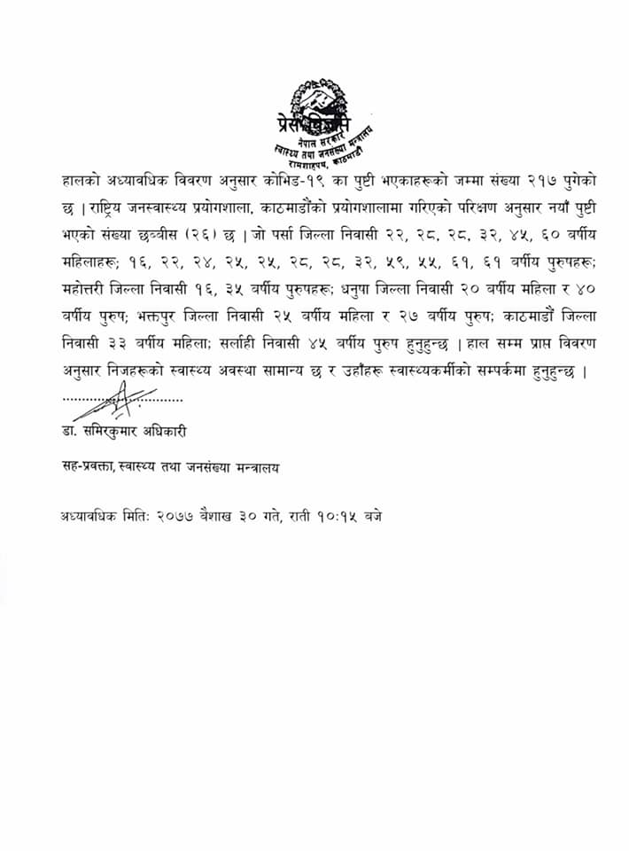 काठमाडौं, ३० बैशाख । रष्ट्रिय जनस्वास्थ्य प्रयोगशाला काठमाडौंमा गरिएको परीक्षणमा मंगलबार काठमाडौंमा उपत्यकामा तीन सहित थप २६ जनामा कोरोना पुष्टि भएको स्वास्थ्य मन्त्रालयले जनाएको छ । आज यसअघि नियमित पत्रकार सम्मेलनमा ५७ जनामा पुष्टि भएको थियो। नेपालमा हालसम्म २१७ जनामा कोरोना संक्रमण पुष्टि भएको छ भने आज एक जना उपचार पछि निको भएका छन् । निको हुनेको संख्या ३४ पुगेको छ ।