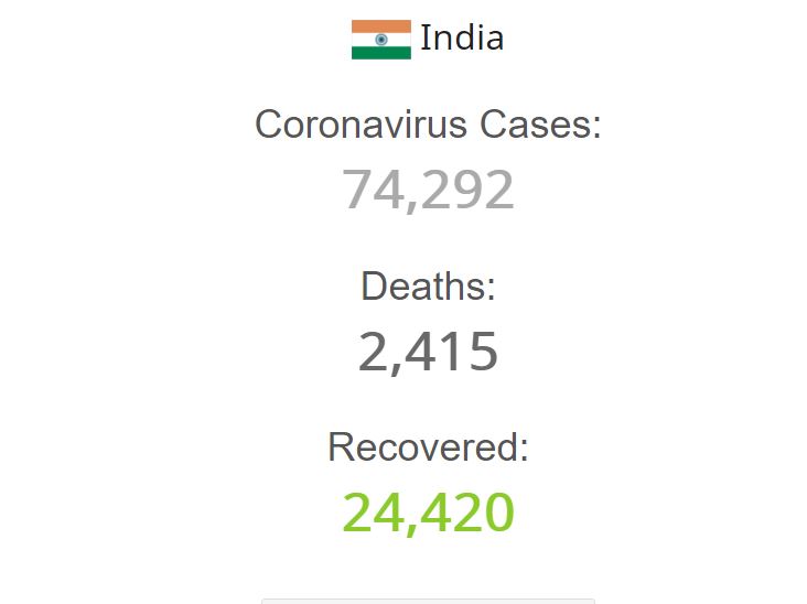 ४७ हजार ७०८ जनाको उपचार भइरहेको छ भने अहिलेसम्म २४ हजार ४२० जना निको भएका छन् । कोराना भाइरसको संक्रमण फैलिने क्रम नरोकिएपछि भारतमा मार्च २४ देखि लकडाउन जारी गरिए पनि क्रमिक रुपमा खुकुलो बनाउँदै लगिएको छ । मंगलबारदेखि भारतमा सीमित संख्यामा रेल सेवा सञ्चालन गर्न दिइएको छ ।