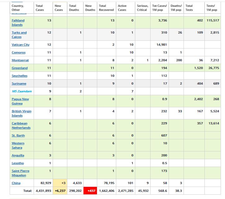 फल्कल्याण्ड आइल्याण्ड्समा १३ जनाा कोरोना सङ्क्रमितमध्ये सबै निको भएर घर फर्किएका छन् । ग्रीनल्याण्डका ११ जना कोरोना सङ्क्रमित पनि निको भएर घर फर्किएका छन् ।यस्तै पपुवा न्यूगिनी, क्यारिबियन नेदरल्याण्ड्सका ६, सेन्ट बार्थका ६, वेस्टर्न सहाराका ६, अङगिलाका ३, सेन्ट पिएरे मिकेलनका १ जना पनि निको भएर घर फर्किएका छन् ।