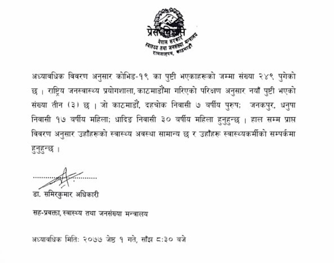 काठमाडौं, दहचोक निवासी ७ वर्षीय बालक, जनकपुर, धनुषा निवासी १७ वर्षीया युवती र धादिङकी ३० वर्षीया महिलामा कोरोना पुष्टि भएको हो । योसँगै संक्रमितको संख्या २४९ पुगेको स्वास्थ्य तथा जनसंख्या मन्त्रालयका सहप्रवक्ता डा.समिरकुमार अधिकारीले जानकारी दिनुभयो ।