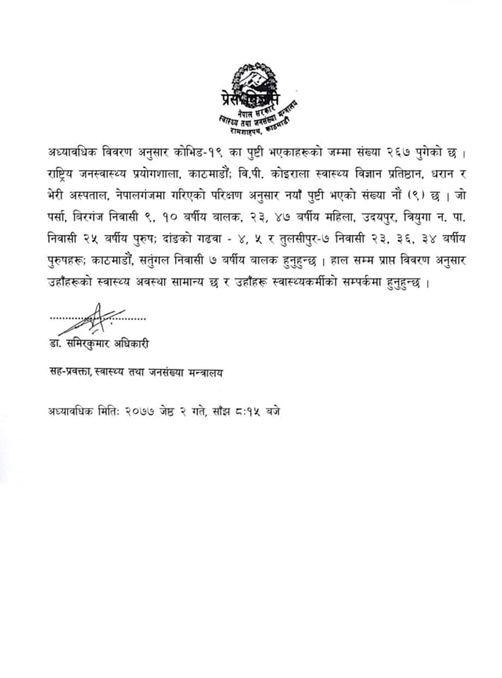 काठमाडौ, २ जेठ । नेपालमा थप ९ जनाको कोरोना भाइरस (कोभिड–१९) को संक्रमण देखिएको छ । यो सगै नेपालमा कोरोना संक्रमितको संख्या २ सय ६७ पुगेको छ । जसमा ३६ जना निको भएका छन्।