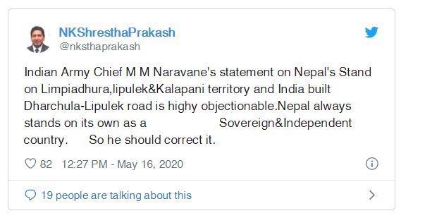 भारतीय सेना प्रमुख मनोज नरभानले नेपालले अरु कसैको उस्काहटमा लिपुलेकको विषय नेपालले उचालेको आरोप लगाएका थिए । तर आज नेकपाका प्रवक्तासमेत रहेका नारायणकाजी श्रेष्ठले भारतीय सेना प्रमुखको भनाई खण्डन गर्दै फिर्ता लिन आग्रह गर्नुभएको छ ।