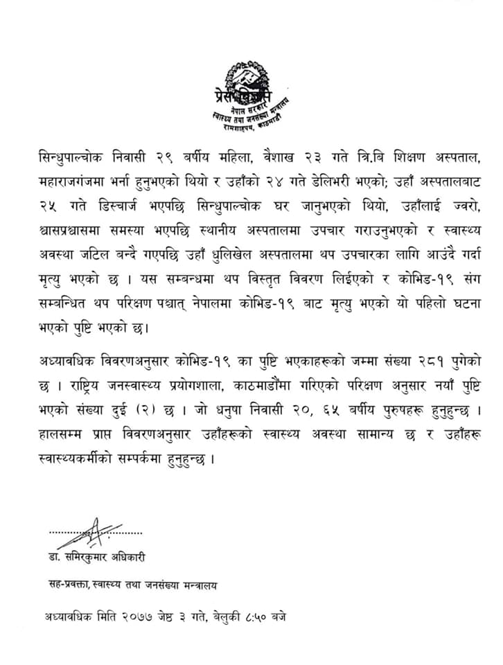 । बिहीबार राति धुलिखेल अस्पततालमा मृत्यु भएकी महिलाको कोरोनाकै कारण मृत्यु भएको स्वास्थ्य तथा जनसंख्या मन्त्रालयले पुष्टि गरेको छ । मन्त्रालयका सहप्रवक्ता डा समिरकुमार अधिकारीले विज्ञप्ति मार्फत २९ वर्षीय महिलाको कोरोनाकै कारण मृत्यु भएको पुष्टि गरेका हुन ।