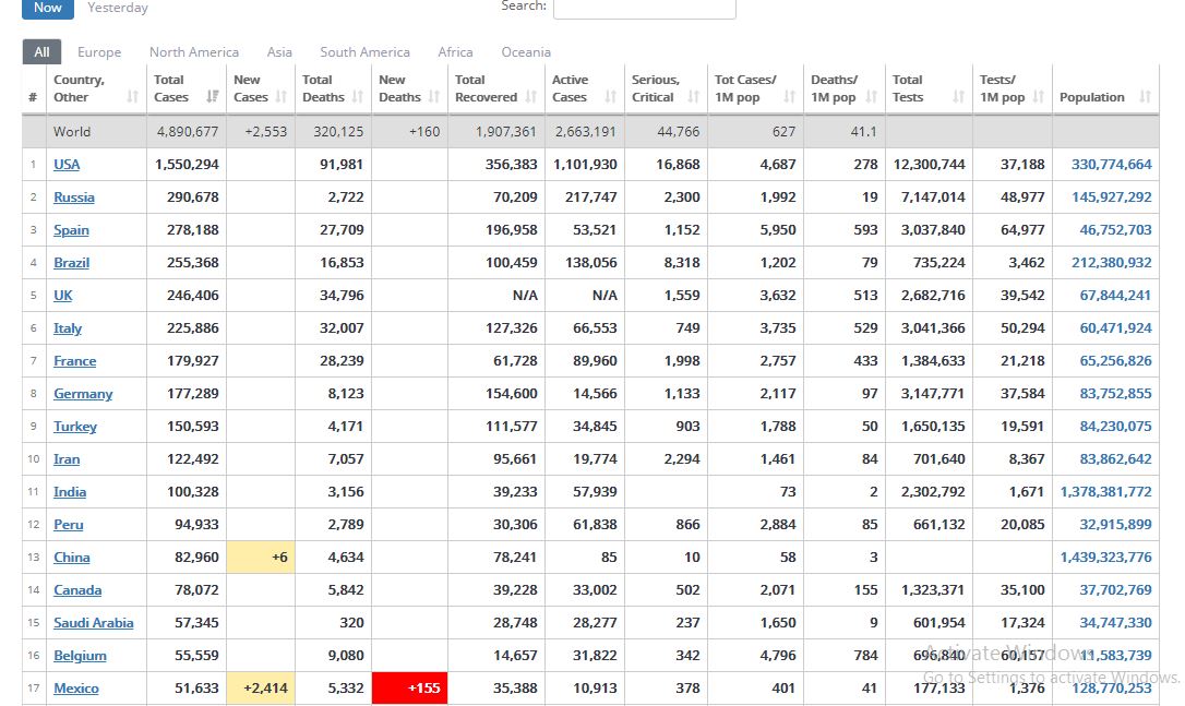 कोरोना भाइरसको महामारीको सबैभन्दा बढी प्रभाव अमेरिकामा परेको छ । त्यहाँ ९१ हजार ९१५ जनाको मृत्यु भएको छ । १५ लाख ४९ हजार ३३४ जना संक्रमित भएका छन् ।