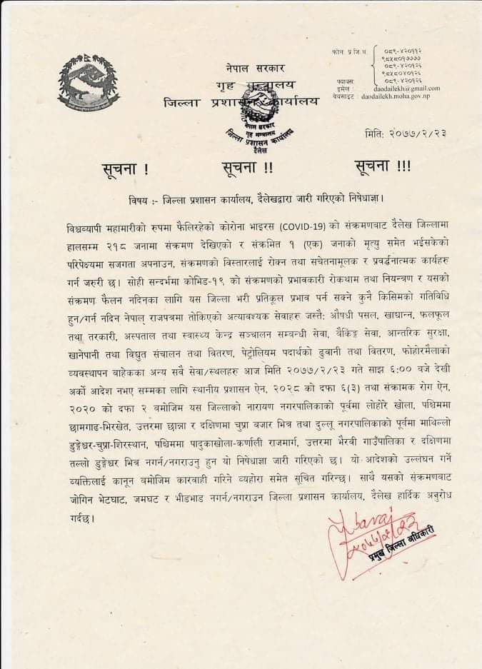 दैलेख, २३ जेठ – जिल्ला प्रशासन कार्यालय दैलेखले नारायण र दुल्लु नगरपालिकामा निषेधाज्ञा जारी गरेको छ । आज (शुक्रबार) साँझ ६ बजेदेखि लागू हुने गरी निषेधाज्ञा जारी गरिएको जिल्ला प्रशासन कार्यालयले जनाएको छ । प्रमुख जिल्ला अधिकारी युवराज कट्टेलले निषेधाज्ञा नारायण नगरपालिकाको पूर्वमा लोहोरेखोला, पश्चिममा छामघाट, उत्तरमा छान्ना र दक्षिणमा चुप्रा बजारभित्र तथा दुल्लु नगरपालिकाको माथिल्लो ढुगेश्वर, चुप्रा शिरिस्थान, पश्चिममा पादुकाखोला र कर्णाली राजमार्ग, उत्तरमा भैरवी गाउँपालिका र पश्चिममा पादुकाखोलासम्म जारी गरिएकोे जानकारी दिनुभयो । कोरोना सङ्क्रमणको जोखिम मानिएको नारायण नगरपालिका क्षेत्रभित्र आवतजावत तथा अतिआवश्यक पर्ने सवारी साधन, औषधि, आन्तरिक सुरक्षालगायतका क्षेत्रबाहेक सम्पूर्ण कार्य बन्द गरिने जनाइएको छ । निषेधाज्ञा उल्लङ्घन गर्नेलाई कानूनबमोजिम कारवाही गरिने विज्ञप्तिमा उल्लेख छ । साथै सङ्क्रमणबाट जोगिन, भीडभाड नगर्न÷नगराउन, जमघटन नहुन सबैलाई प्रशासनले आग्रह गरेको छ ।