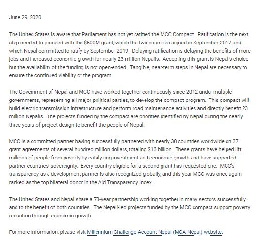‘यस ५० करोड डलरको अनुदानलाई अगाडि बढाउन आवश्यक अघिल्लो कदम अनुमोदन हो,’ विज्ञप्तिमा भनिएको छ । नेपालले असार १६ गते भित्रमा सम्झौताको शर्तअनुसार संसदबाट उक्त सम्झौतालाई अनुमोदन गरिसक्नु पर्ने थियो । तर, सत्तारुढ दल नेकपाभित्रकै विवादको कारण एमसीसी संसदबाट अनुमोदन गर्ने वा नगर्ने भन्ने पार्टीले टुंगो लगाउन सकेको छैन ।