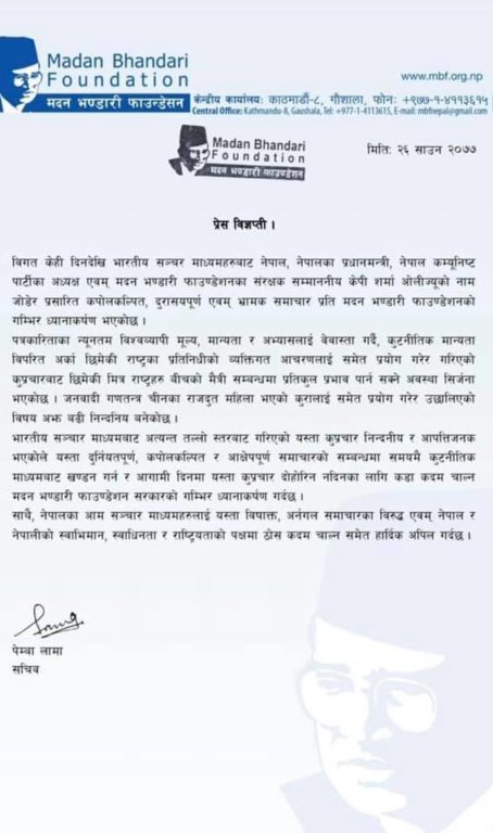 काठमाडौँ, २८ असार। मदन भण्डारी फाण्डेशनले केही भारतीय सञ्चारमाध्यमले नेपाल र नेपालका प्रधानमन्त्रीका बारेमा कपोलकल्पित सामग्री प्रसारण गरेकामा निन्दा गरेको छ ।