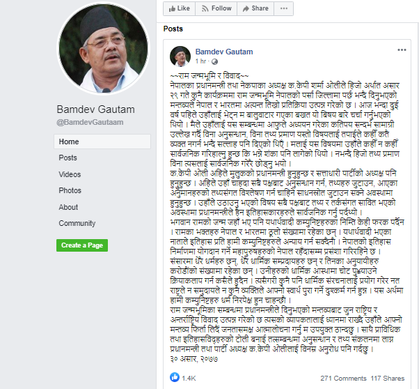 गौत्तमले फेसबुकमा लेख्दै भनेका छन् – उहाँले उठाउनु भएको विषय सबै पक्षबाट तथ्य र तर्कसंगत सावित भएको अवस्थामा प्रधानमन्त्रीले हैन इतिहासकारहरुले सार्वजनिक गर्नुपर्दथ्यो । रामको जन्म जहाँ भए पनि यथार्थवादी कम्युनिष्टहरुका निम्ति केही फरक पर्दैन । उनले रामका भक्तहरु नेपाल र भारतमा ठूलो संख्यामा रहेका बताएका छन् ।