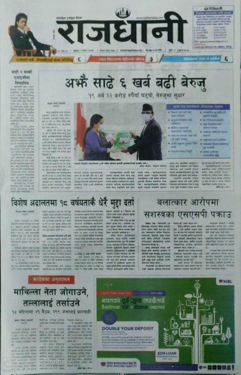 अघिल्लो वर्ष २०७४(७५ भन्दा १९ अर्ब २२ करोड रुपैयाँ बेरुजु रकम घटेको महालेखापरीक्षकको कार्यालयले जनाएको छ । महालेखापरीक्षकको ५७औं वार्षिक प्रतिवेदनअनुसार अघिल्लो वर्षसम्मको बेरुजु ६ खर्ब ८३ अर्ब ६६ करोड रुपैयाँ रहेको थियो । तर, हाल भने बेरुजु फछ्र्योट गर्ने क्रममा सुधार देखिएको छ ।, यो खबर पनि आजको राजधानी दैनिकले पहिलो पृष्ठमा ‘अझै साढे ६ खर्ब बढी बेरुजु, १९ अर्ब २२ करोड रुपैयाँ घट्यो, बेरुजुमा सुधार’ शिर्षकमा छापेको छ ।