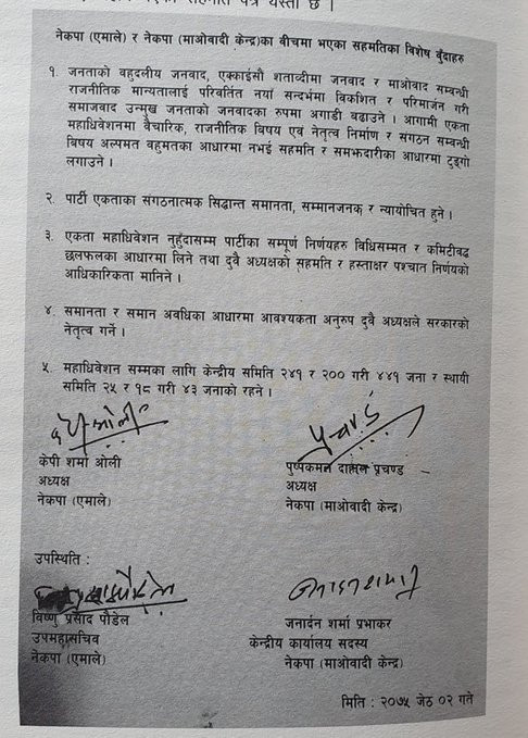 डकुमेण्टमा प्रधानमन्त्री आलोपालो चलाउने सार्वजनिक घोषणा गर्दा सरकार कमजोर हुने र कर्मचारीहरुले पनि सरकारलाई नटेर्ने भएकाले यो सहमतिलाई ‘जेन्टलमेन एग्रिमेण्टका रुपमा मात्र लिने दुवै नेता सहमत भएका थिए ।नेकपा स्थापना भएको ७० वर्ष पछि पुनः नेकपा बनेको छ । नेकपा दुई तिहाइ सिटसहित सत्तारुढ दल बनेको छ ।