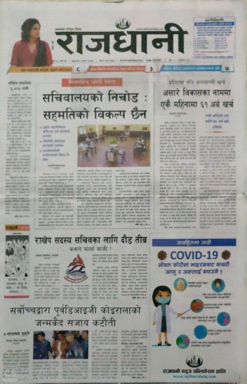 त्यस्तै, राजधानी दैनिकले पनि नेकपा विवादबारे पहिलो पृष्ठमा खबर छापेको छ ।, समाचार अनुसार सत्तारूढ नेपाल कम्युनिस्ट पार्टी (नेकपा)को सचिवालय बैठकले पार्टीमा व्याप्त संकटलाई आपसी संवाद र सहमतिमा नै टुंगोमा पुर्याउनुपर्ने निचोड निकालेको छ ।