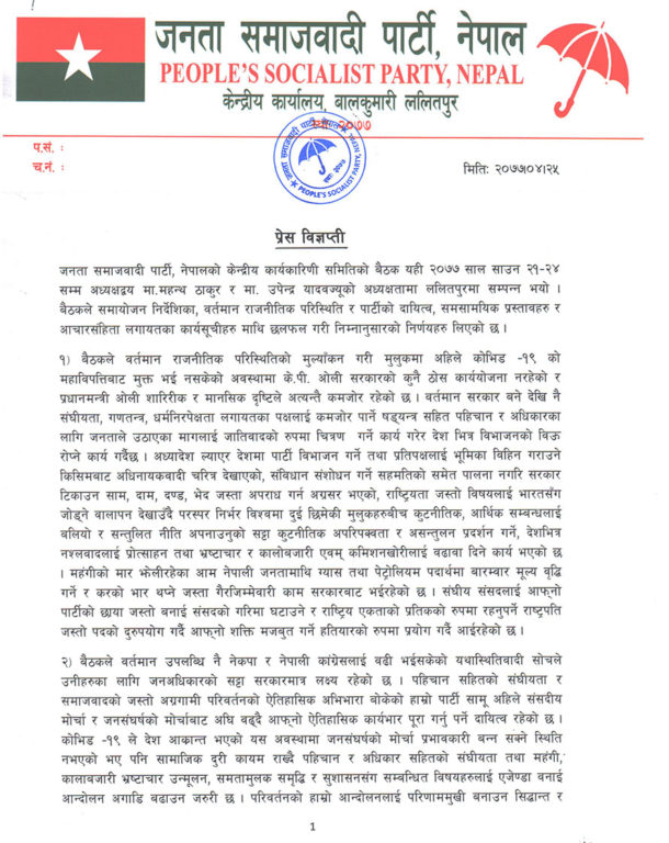 जसपा अध्यक्षद्वय महन्थ ठाकुर र उपेन्द्र यादवको नेतृत्वमा बसेको चार दिने बैठकले वर्तमान राजनीतिक परिस्थितिको मूल्यांकन गरी कोभिड–१९ को महाविपत्तिबाट मुक्त भई नसकेको अवस्थामा ओली सरकारको कुनै ठोस कार्ययोजना नरहेको आरोप लगाएको छ । जसपाले प्रधानमन्त्री ओलीलाई अध्यादेश ल्याएर देशमा पार्टी विभाजन गर्ने तथा प्रतिपक्षलाई भूमिका विहीन गराउने किसिमबाट अधिनायवादी चरित्र देखाएको आरोप लगाएको छ ।