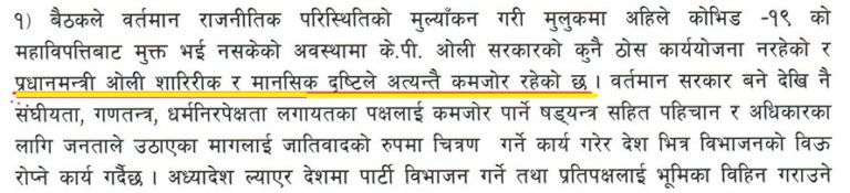 काठमाडौं, २५ साउन । जनता समाजवादी पार्टी जसपाको केन्द्रीय कार्यकारिणी समितिको बैठकले प्रधानमन्त्री केपी शर्मा ओलीको शारीरिक र मानसिक दृष्टिले अत्यन्तै कमजोर रहेको ठहर गरेको छ । प्रधानमन्त्रीको स्वास्थ्यबारे कडा टिप्पणी गर्दै जसपाले मानसिक तथा शारीरिक स्वास्थ्यबारे टिप्पणी गरेको हो ।