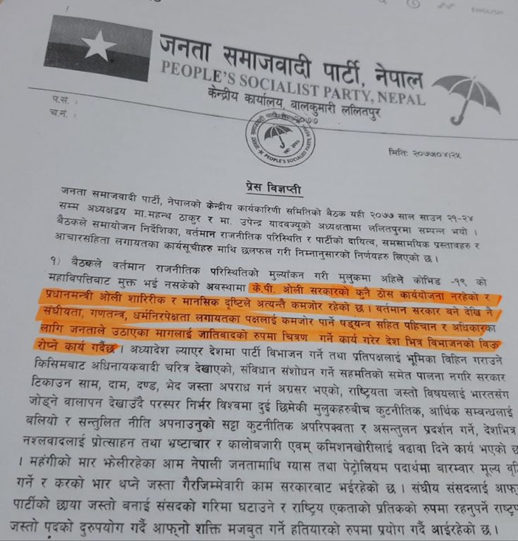 प्रधानमन्त्रीका प्रेस सल्लाहकार सूर्य थापाले आज प्रेस नोट जारी गर्दै जनता समाजवादी पार्टी नेपालले जारी गरेको विज्ञप्तिको एक अंशप्रति गम्भीर ध्यानाकर्षण भएको जनाएका हुन् । थापाले ‘केपी ओली सरकारको कुनै ठोस कार्ययोजना नरहेको र प्रधानमन्त्री शारीरिक र मानसिक दृष्टिले अत्यन्तै कमजोर रहेको टिप्पणीप्रति अशिष्ट र पूर्वाग्रही टिप्पणी अत्यन्त दुराशयपूर्ण र खेदजनक रहेको बताएका छन् ।