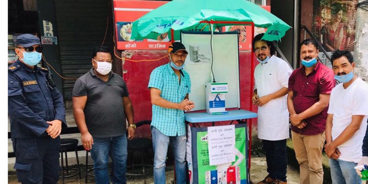 फिल्म वितरक तथा जागौँ युवा अभियानका अध्यक्ष करण श्रेष्ठको पहलमा पूर्वी ढोका परिसरमा स्यानिटाइजर बुथ रखिएको हो । उक्त बुथको आज एक कार्यक्रमबीच हास्य कलाकार दीपकराज गिरी, अनामनगर प्रहरी वृत्तका प्रहरी नायब उपरीक्षक हरिबहादुर बस्नेत, गुण सिनेमा प्रालिका सञ्चालक महेशप्रसाद किजु र अभियानका अध्यक्ष करन श्रेष्ठले संयुक्त रुपमा उद्घाटन गरे ।