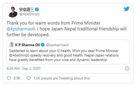 उक्त समाचार सार्वजनिक भएपछि प्रधानमन्त्री ओलीले ट्वीट गर्दै आबेको शीघ्र स्वास्थ्य लाभको कामना गरेका थिए। प्रधानमन्त्री ओलीले आफ्नो ट्वीटरवालमा भनेका छन् । तपाईं बिरामी भएको सुनेर दु ख लाग्यो। प्रधानमन्त्री आबे तपाईंको शीघ्र स्वास्थ्यलाभ र सु(स्वास्थ्यको कामना गर्दछु। तपाईंको बहुआयामिक नेतृत्वबाट नेपाल(जापान सम्बन्धमा धेरै फाइदा भएको छ।