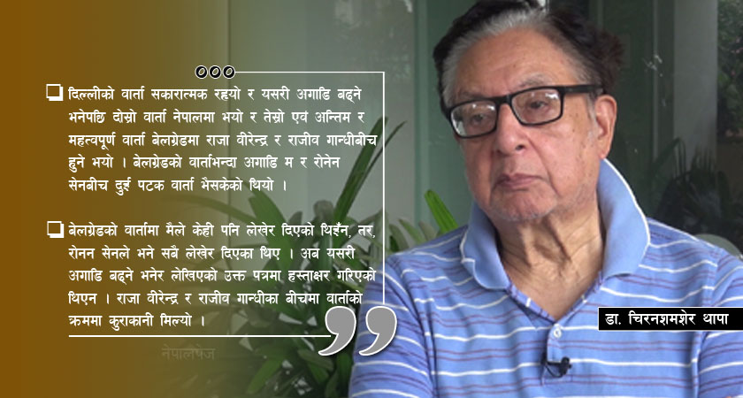 ‘दिल्लीको वार्ता सकारात्मक रह्यो र यसरी अगाडि बढ्ने भनेपछि दोस्रो वार्ता नेपालमा भयो र तेस्रो एवं अन्तिम र महत्वपूर्ण वार्ता बेलग्रेडमा राजा वीरेन्द्र र राजीव गान्धीबीच हुने भयो । बेलग्रेडको वार्ताभन्दा अगाडि म र रोनेन सेनबीच दुई पटक वार्ता भैसकेको थियो ।’ ‘बेलग्रेडको वार्तामा मैले केही पनि लेखेर दिएको थिइँन, तर, रोनन सेनले भने सबै लेखेर दिएका थिए । अब यसरी अगाडि बढ्ने भनेर लेखिएको उक्त पत्रमा हस्ताक्षर गरिएको थिएन । राजा वीरेन्द्र र राजीव गान्धीका बीचमा वार्ताको क्रममा कुराकानी मिल्यो ।’