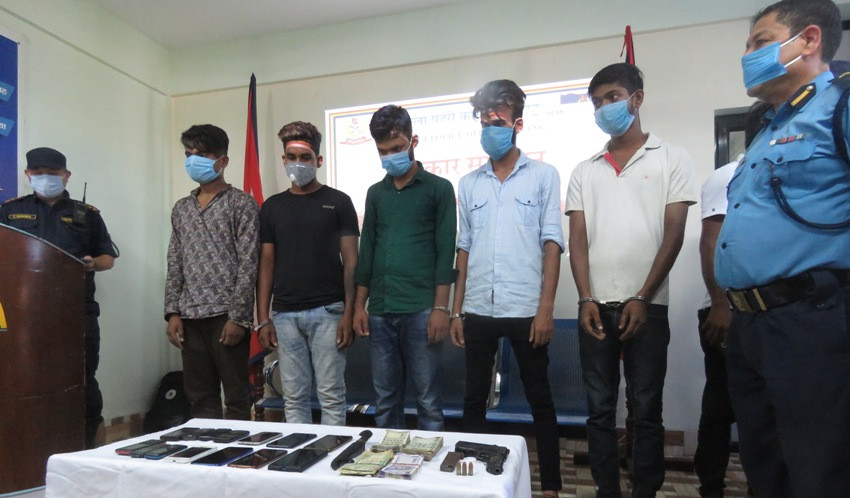 काठमाडौं, १७ भदौ । व्यापारीका रुपमा कार्य गरी अन्य व्यापारी एवं व्यवसायीलाई ज्यान मार्ने धम्की तथा डर त्रास देखाई रकम असुल गर्ने पाँच जनाको समूहलाई प्रहरीले पक्राउ गरी आज यहाँ सार्वजनिक गरेको छ । जिल्ला प्रहरी कार्यालय मोरङमा आज आयोजित पत्रकार सम्मेलनमा भारत विहार सीतामणि जिल्ला घर भई विराटनगर जलजला मोडस्थित चाइना बजारमा कपडाको कारोबार गर्ने २७ वर्षीय राज साह, मोरङको कहटरी गाउँपालिका–२ बस्ने २६ वर्षीय किसन साह, सोही स्थान बस्ने २८ वर्षीय एलेक्स भन्ने रविन शर्मा, २७ वर्षीय अभिषेक राय र सप्तरी जिल्ला बोदेबर्साइन नगरपालिका–८ काचन बस्ने २७ वर्षीय नन्दकिशोर साहलाई विराटनगर र कटहरीबाट पक्राउ गरी सार्वजनिक गरिएको हो ।