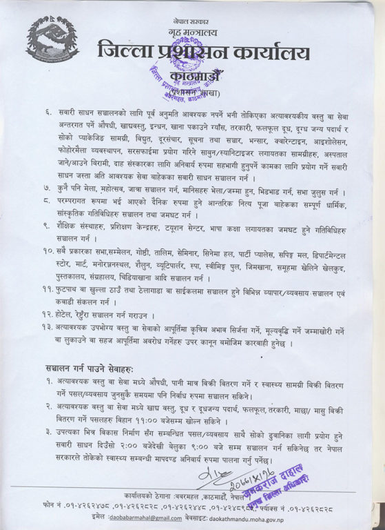 त्यस्तै विकास निर्माणसँग सम्बन्धित पसल दिउँसो २ देखि राति ९ बजेसम्म खुल्ने भएको छ । छोटो दूरीको ढुवानीका लागि प्रयोग हुने सवारी साधन पनि दिउँसो २ देखि ९ बजेसम्म चल्न पाउनेछन् ।