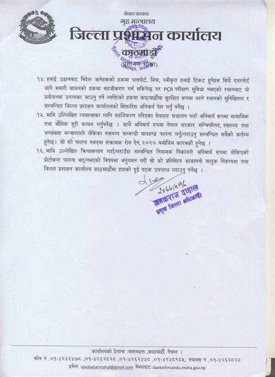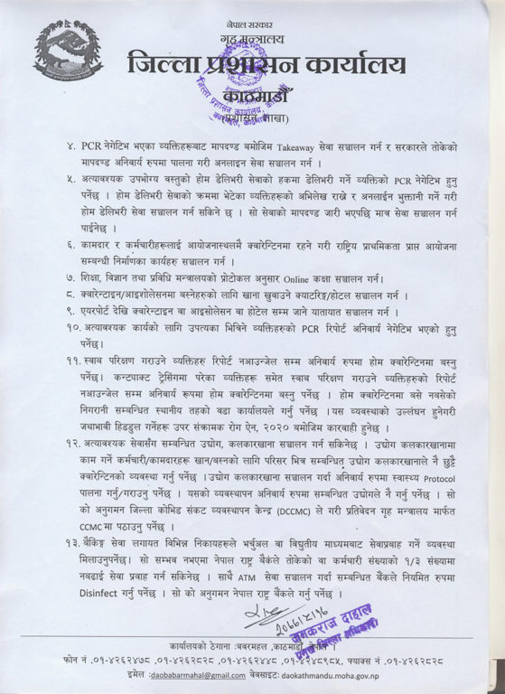 निषेधाज्ञाको समयमा यसअघि प्रतिबन्ध लगाइएको टेक अवे र उपभोग्य वस्तुको होम डेलिभरी सेवा भने खुला गरिएको छ । होम डेलिभरी सेवाको मापदण्ड भने जिल्ला प्रशासन कार्यालयले छिट्टै जारी गर्नेछन् । होम डेलिभरी र टेक अवे सेवा दिने व्यक्तिको पीसीआर परीक्षणको रिपोर्ट नेगेटिभ हुनुपर्नेछ र उनीहरुले भेटेका व्यक्तिहरुको अभिलेख राख्नुपर्नेछ । अब अत्यावश्यक कामका लागि काठमाडौं उपत्यका प्रवेशका लागि पीसीआर रिपोर्टमा कोरोना संक्रमण नभएको पुष्टि अनिवार्य गरिएको छ ।