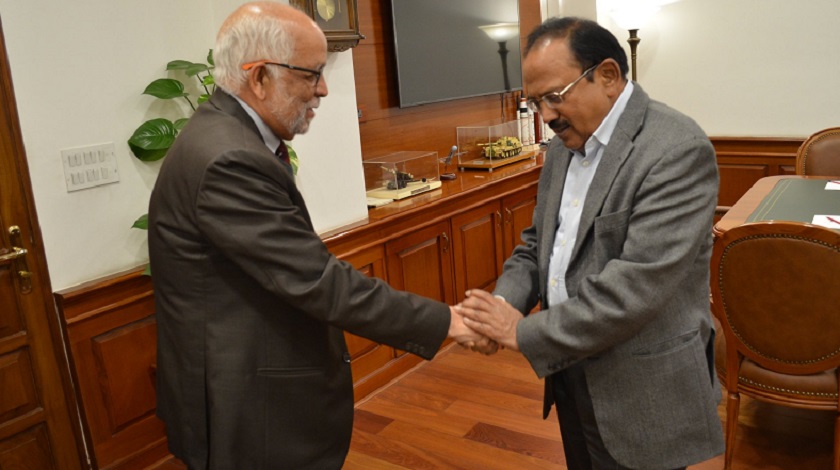 Nepal Ambassador to India Mr. Acharya and national security advisor of Indian government Ajit Doval, Hansdahaking and hold meeting at nepal embassy in New Delhi. Photo from Mr Acharaya’s twitter.