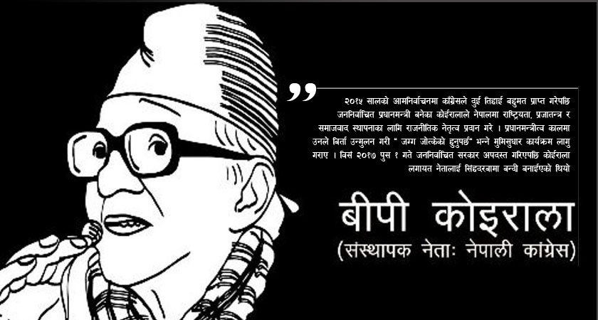 काठमाडौँ, २३ भदौ । नेपालको राजनीति र साहित्यमा महत्वपूर्ण योगदान दिएका प्रथम जननिर्वाचित प्रधानमन्त्री बिपी कोइरालाको १०७ औँ जन्म जयन्ती विभिन्न कार्यक्रम गरी बुधबार देशभर मनाइँदैछ । नेपालमा प्रजातन्त्रको स्थापना एवं पुनस्र्थापनाका लागि कठोर सङ्घर्ष गरेका कोइरालाको विसं १९७१ भदौ २४ गते जन्म भएको थियो । जहानियाँ राणा शासनको विरोधमा उनका पिता कृष्णप्रसाद कोइरालाले गरिब किसानले पहिरेको कपडा राणा प्रधानमन्त्री चन्द्रशम्शेरलाई पार्सल गरी पठाएपछि कोइराला परिवार भारत निर्वासनमा जानु परेको थियो ।