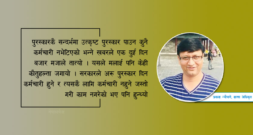 पुरस्कारकै सन्दर्भमा उत्कृष्ट निजामती पुरस्कार पाउन कुनै कर्मचारी नभेटिएको भन्ने खबरले एक दुई दिन बजार मजाले तात्यो । यसले मलाई पनि केही कौतुहल्ता जगायो । सरकारले अरु पुरस्कार दिन कर्मचारी हुने र त्यसकै लागि कर्मचारी नहुने जस्तो गरी काम नगरेको भएपनि हुन्थ्यो । त्यो पुरस्कार प्राप्त गर्ने पक्कै पनि केही सूचकहरु छन, जसमा राज्यका लागी गरिने योगदान ,त्यस बाट प्राप्त परिणाम ,परिणाम बाट देखिएको परिबर्तन, इमन्दरिता, नैतिकता सेवा भाब नै मुख्य बिषय होलान् । सूचकहरु मेल नखाँदा नै पुरस्कारको ब्यबस्था नभएको होला भन्ने मेरो सानो बुझाई छ । पुरस्कार प्राप्त गरेकाले बिगतमा गल्ती गरेको कारण सरकार सतर्क रहनु पनि नराम्रो पक्ष होइन । तर, सरकारले हुलाक हेरेको भए त्यस्ता कर्मचारी हुलाकमा भेटिन सक्थे होला भन्ने मात्र मेरो आशय हो ।