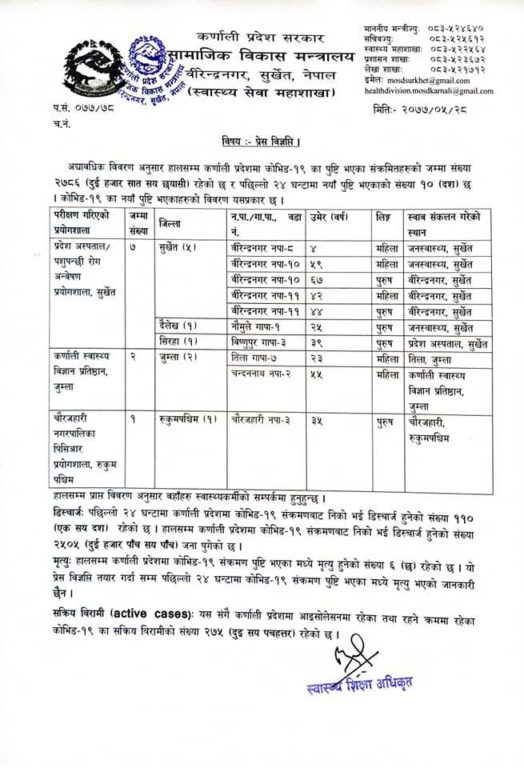 यसैबीच आइतबार कर्णालीमा १० जनामा कोरोना सङ्क्रमण पुष्टि भएको छ । जसमा सुर्खेतका पाँच जना, जुम्लाका दुई जना, दैलेखका एक जना, सिरहाका एक जना र रुकुम पश्चिमका एक जना रहेका छन् ।