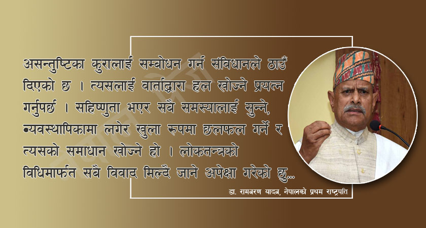मुलुकमा एक राजनीतिक प्रणाली अन्त्य भएको र अर्को स्थापित भई नसकेको अत्यन्त तरल राजनीतिक अवस्थामा भिन्न भिन्न राजनीतिक आन्दोलन र पृष्ठभूमिका दललाई काखापाखा नगरी अभिभावकत्व प्रदान गर्दै दुई पटक संविधानसभाको निर्वाचन गराएर सहजरुपमा राजनीतिक अवतरण गराउन उनले खेलेका भूमिकाको सर्वत्र प्रशंसा हुँदैआएको छ । नेपालको संविधान जारी भएको पाँच वर्ष पूरा गरेको अवसरमा पूर्वराष्ट्रपति यादव संविधानको कार्यान्वयन गर्ने सन्दर्भमा लोकतन्त्रको मर्म र संविधानको भावना बुझेर काम गर्न विधायिका, सरकार र राजनीतिक दललाई सुझाव दिन्छन् । उनी भन्छन् – “असन्तुष्टिका स्वरलाई विधायिकाले सहिष्णु भएर संविधान सम्मतरुपमा कानून बनाई सम्बोधन गर्ने प्रयत्न गर्नुपर्छ ।” संविधान दिवस र समसामयिक विषयमा केन्द्रित रहेर डा. रामवरण यादव गरिएको कुराकानीको प्रस्तुत छः
