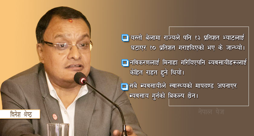अहिले व्यवसायीहरुले आपनो कर्मचारीहरुलाई अहिले व्यपार छैन भनेर अलि अलि काम चलाउने मात्र तलब दिएर धानिररहेका छौ । घरवहाल तिर्न पनि साना ब्यवसायीहरुलाई गाह्रो भइरहेको अवस्था छ । यस्तो बेलामा राज्यले पनि १३ प्रतिशत भ्याटलाई घटाएर १० प्रतिशत गराइदिएको भने के जान्थ्यो । अहिले त व्यवसायीले केही नभने पनि घटाइदिनु पर्ने बेला हो । करको दर कम भयो भने करमा विचलन हुदैन । कर छल्नु भन्दा कर तिर्न व्यवसायीलाई फाइदा भए करको बिचलन हुदैनथ्यो ।