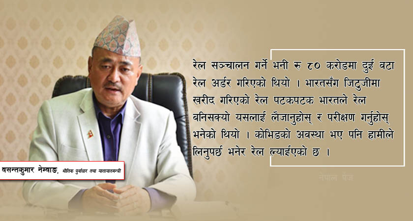 रेल सञ्चालन गर्ने भनी रु ८० करोडमा दुई वटा रेल अर्डर गरिएको थियो । भारतसँग जिटुजीमा खरीद गरिएको रेल पटकपटक भारतले “रेल बनिसक्यो यसलाई लैजानुहोस् र परीक्षण गर्नुहोस्” भनेको थियो । कोभिडको अवस्था भए पनि हामीले जिम्मा लिनुपर्छ भनेर रेल ल्याइएको छ । नेपाली झण्डा बोकेको रेल सञ्चालन गर्ने प्रधानमन्त्रीको सपना छ । यो मात्रै होइन उत्तर तिब्बतदेखि काठमाडौँ, भारतसँग रक्सौलबाट काठमाडौँ, काँकडभित्ताबाट गड्डाचौकीसम्म रेल चल्नुपर्छ । विद्युत्मा आत्मनिर्भर भइसककेको अवस्थामा विद्युतीय रेललाई विस्तार गर्नुपर्छ । रेल चल्नुपर्छ भन्दा कागजको डब्बा बनाएको पनि देखियो तर यो साँच्चै रहेछ भन्ने कुरा रेल आएपछि आफैँ बोलेको छ । केही वर्षपछि उत्तरबाट पनि काठमाडौँमा रेल आउनेछ ।