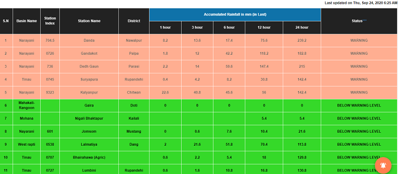 त्यस्तै नारायणी नदीमा बाढी आएको छ । देवघाट बाढी मापन केन्द्रमा जलसतहले सतर्कता तह पार गरेको साथै बढ्दो अवस्थामा रहेकाले चितवन र नवलपरासीको तटीय क्षेत्रमा बस्नेहरुलाई उच्च सतर्कता अपनाउन बाढी पूर्वानुमान महाशाखाले आग्रह गरेको छ । सिन्धुपाल्चोक, रसुवा, धादिङ, गोरखा, लमजुङ, तनहुँ, कास्की, बाग्लुङ, पर्वत, म्याग्दी, रूकुम भएर बग्ने साना नदीमा आकस्मिक बहावका साथै आसपास पहिरोको जोखिम रहेकाले उच्च सतर्कता अपनाउन भनिएको छ ।