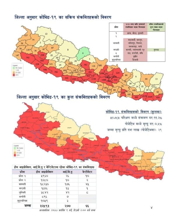 काठमाडौँ, ९ कात्तिक । नेपालको पछिल्लो कोरोना भाईरस (कोभिड-१९)को अपडेट तथ्यांकमा संक्रमणमुक्त हुनेको संख्या बढी देखिन थालेको छ । स्वास्थ्य तथा जनसंख्या मन्त्रालयका अनुसार नेपालमा लगातार दोस्रो दिन नयाँ संक्रमितभन्दा निको भएर डिस्चार्ज हुनेको संख्या बढि देखिएको हो ।