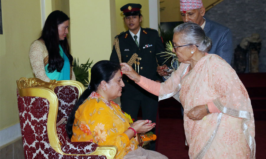 सो अवसरमा राष्ट्रपति भण्डारीले छोरीज्वाइँहरु उषाकिरण, निशाकुुसुम, उमेश थापा र अभिषेक यादव तथा दुई नातिनी एवं पाश्र्ववर्तीहरुलाई पनि टीका लगाइदिएकी थिइन् ।