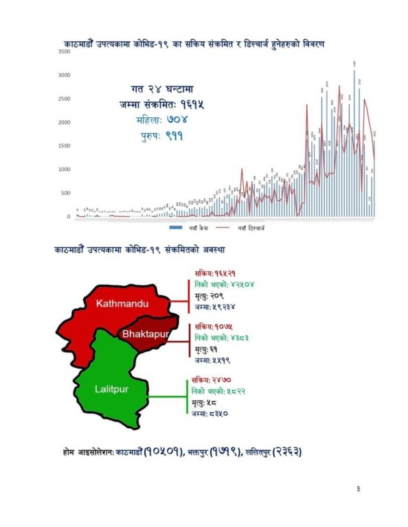 यससँगै काठमाडौंमा कोरोना संक्रमितको संख्या ५९ हजार २३४ पुगेको छ भने त्यसमध्ये ४२ हजार ५०४ जना निको हुँदा सक्रिय संक्रमित १६ हजार ५२१ जना रहेका छन् । हालसम्म काठमाडौंमा २०९ जनाको मृत्यु भएको छ । यसैगरी भक्तपुरमा ५ हजार ५१९ जना संक्तमित रहेकोमा ४ हजार ३८३ जना निको भएका छन् । यस्तै हाल १०७५ जना सक्रिय संक्रमित रहेको भक्तपुरमा ६१ जनाको कोरोनाबाट मृत्यु भएको छ ।