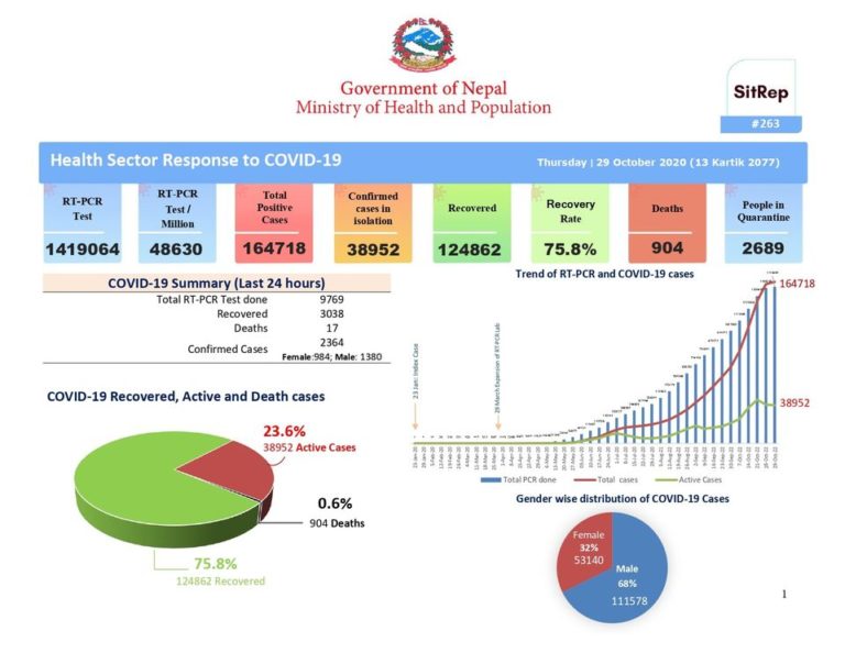 काठमाडौँ, १३ कात्तिक । नेपालमा पछिल्लो २४ घण्टामा थप २ हजार ३६४ जनामा कोरोना भाईरस (कोभिड-१९) संक्रमण पुष्टि भएको हो । स्वास्थ्य तथा जनसंख्या मन्त्रालयले सार्वजनिक गरेको तथ्यांक अनुसार हालसम्म नेपालमा १ लाख ६४ हजार ७१८ संक्रमितको संख्या पुगेको छ ।