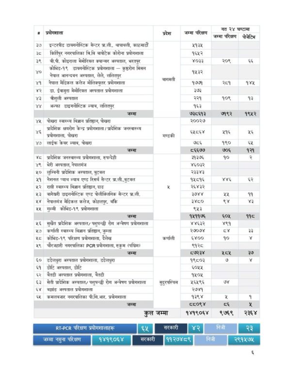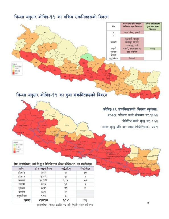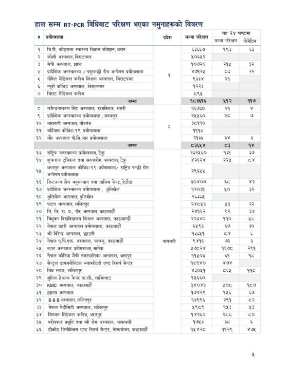 हालसम्म देशभरी सक्रिय संक्रमितको संख्या ३८ हजार ९५२ रहेको छ । यस्तै हालसम्म क्वारेन्टाइनमा रहनेको संख्या २ हजार ६८९ जना रहेका छन् । हालसम्म पीसीआर विधिबाट १४ लाख १९ हजार ६४ परीक्षणहरु गरिएका गरिएको स्वास्थय मन्त्रालयले जनाएको छ । २४ घण्टामा जम्मा ९ हजार ७६९ पीसीआर परीक्षण भएका छन् ।