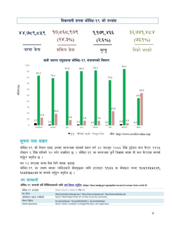 स्वास्थय मन्त्रालयको अनुसार यो अवधिमा ३ हजार ३८ जना कोरोना संक्रमणबाट निको भएर डिस्चार्ज भएका छन् । यो सँगै निको हुनेको संख्या १ लाख २४ हजार ८६२ पुगेको सरकारी तथ्यांकमा उल्लेख छ ।